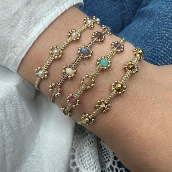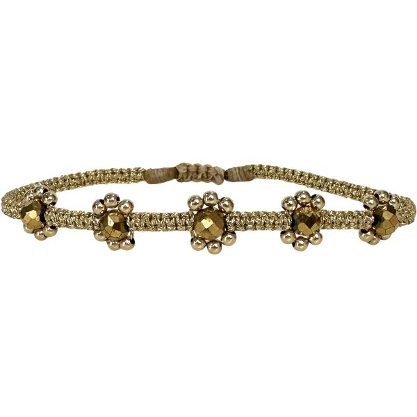 Delicada y femenina, esta pulsera está tejida a mano con hilos metálicos dorados, hematitas y cuentas bañadas en oro de 14k. ¡Lúcela con tus accesorios favoritos durante toda la temporada!