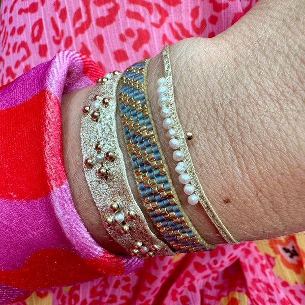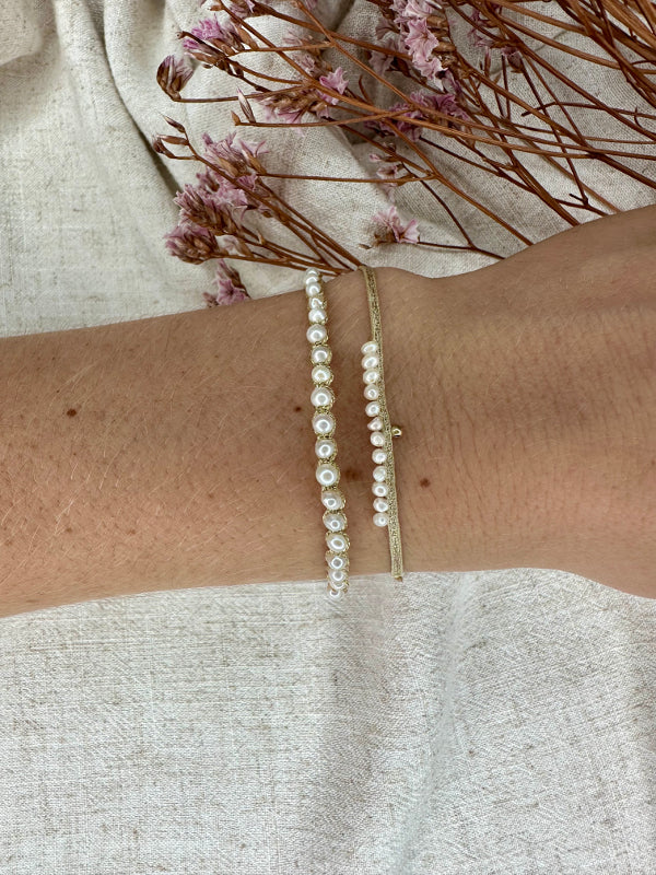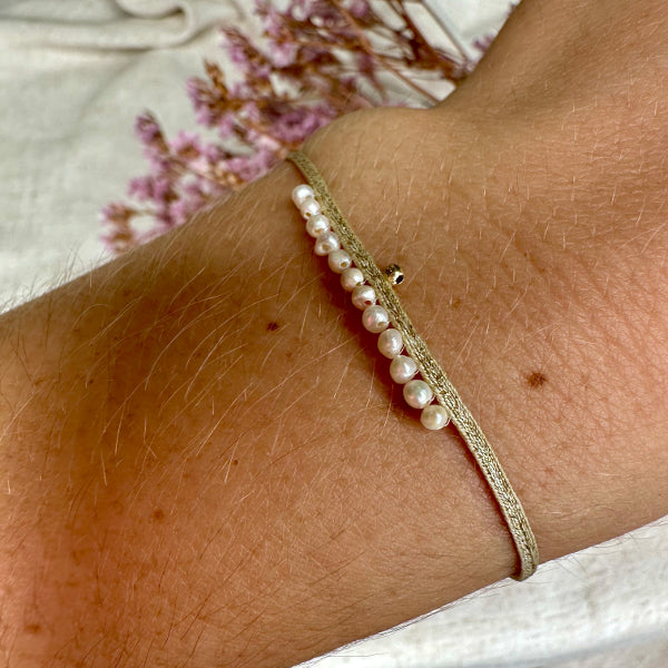 Entrelazada con delicados hilos dorados, la pulsera no solo realza la belleza natural de las perlas, sino que también añade un toque de sofisticación y lujo. El cálido brillo del oro complementa la elegante frescura de las perlas, haciendo de esta pulsera la opción perfecta tanto para el día a día como para ocasiones especiales.
