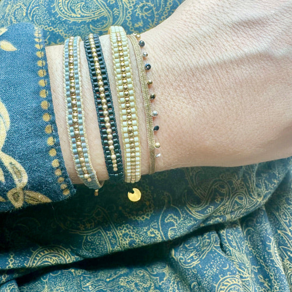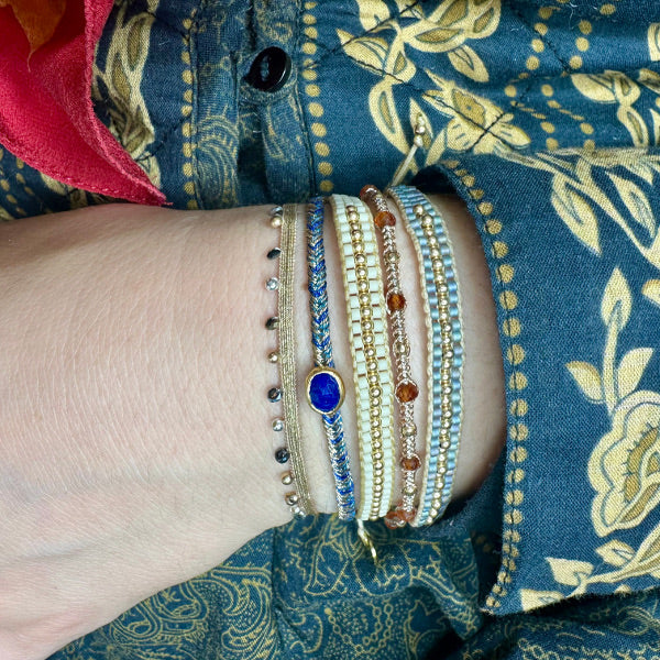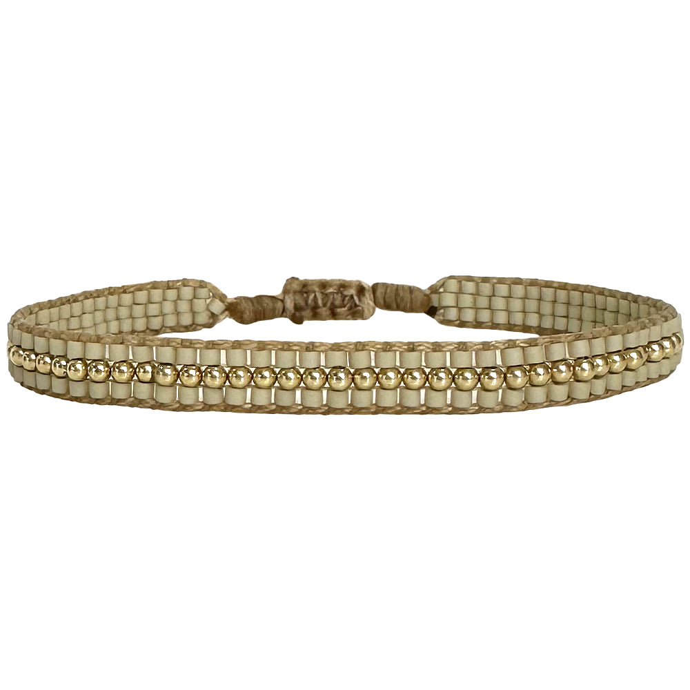 Esta exquisita pieza luce una deslumbrante variedad de cuentas de vidrio japonesas en un hermoso tono neutro, creando un look sofisticado y versátil. En el centro de la pulsera se encuentra una hilera de cuentas bañadas en oro de 14k, que añade un toque de lujo que eleva este diseño a nuevas alturas. Su delicado diseño garantiza que pueda lucirse en cualquier ocasión, desde salidas informales hasta eventos formales. Déjate seducir por la belleza del trabajo artesanal con la Pulsera Ava, donde la elegancia atemporal se une al estilo moderno.
